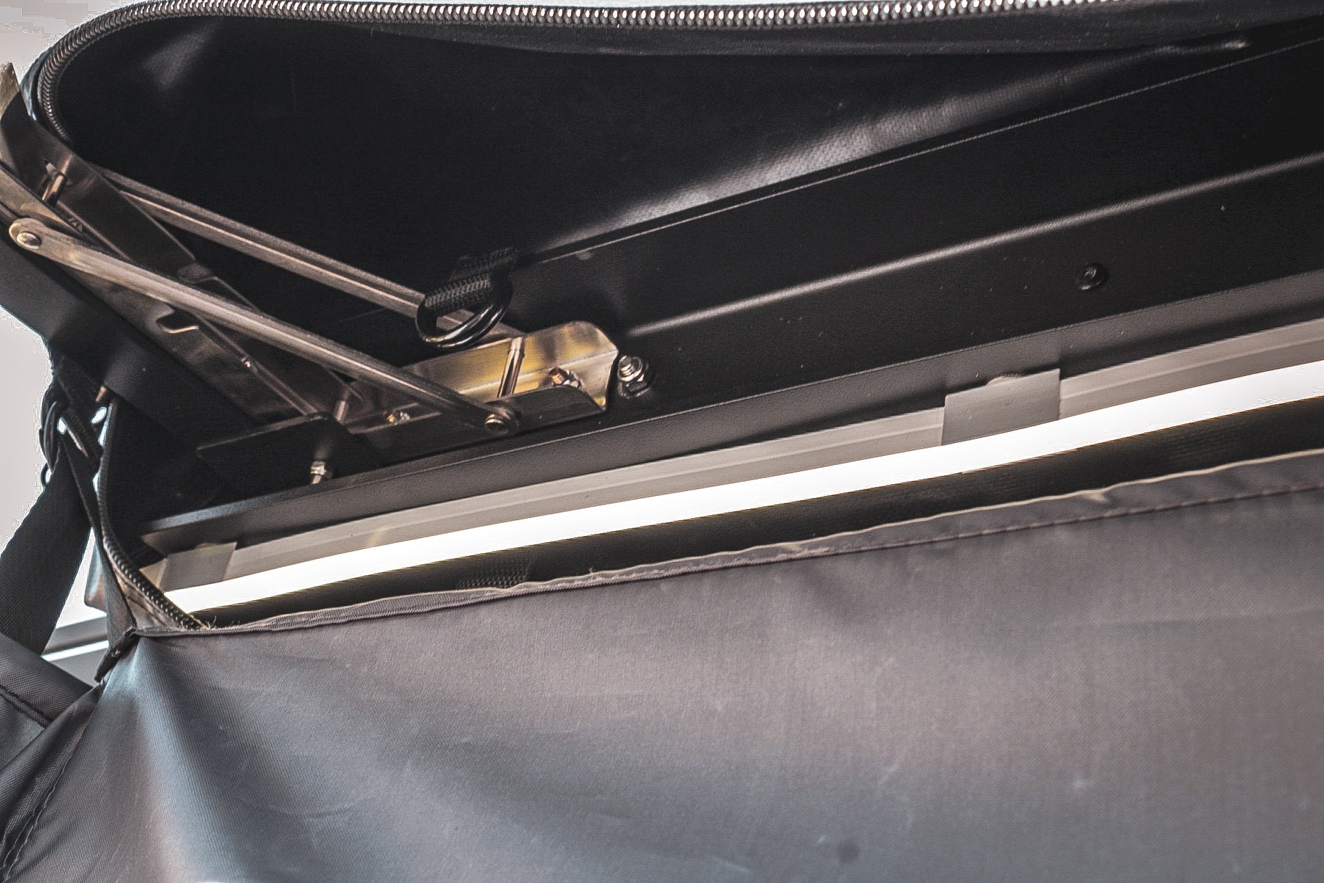 Bolsillo y bolsa interior de malla, tira LED, soporte para ducha, cremallera resistente para fácil acceso, puntos de anclaje en la base, correas ajustables para la longitud